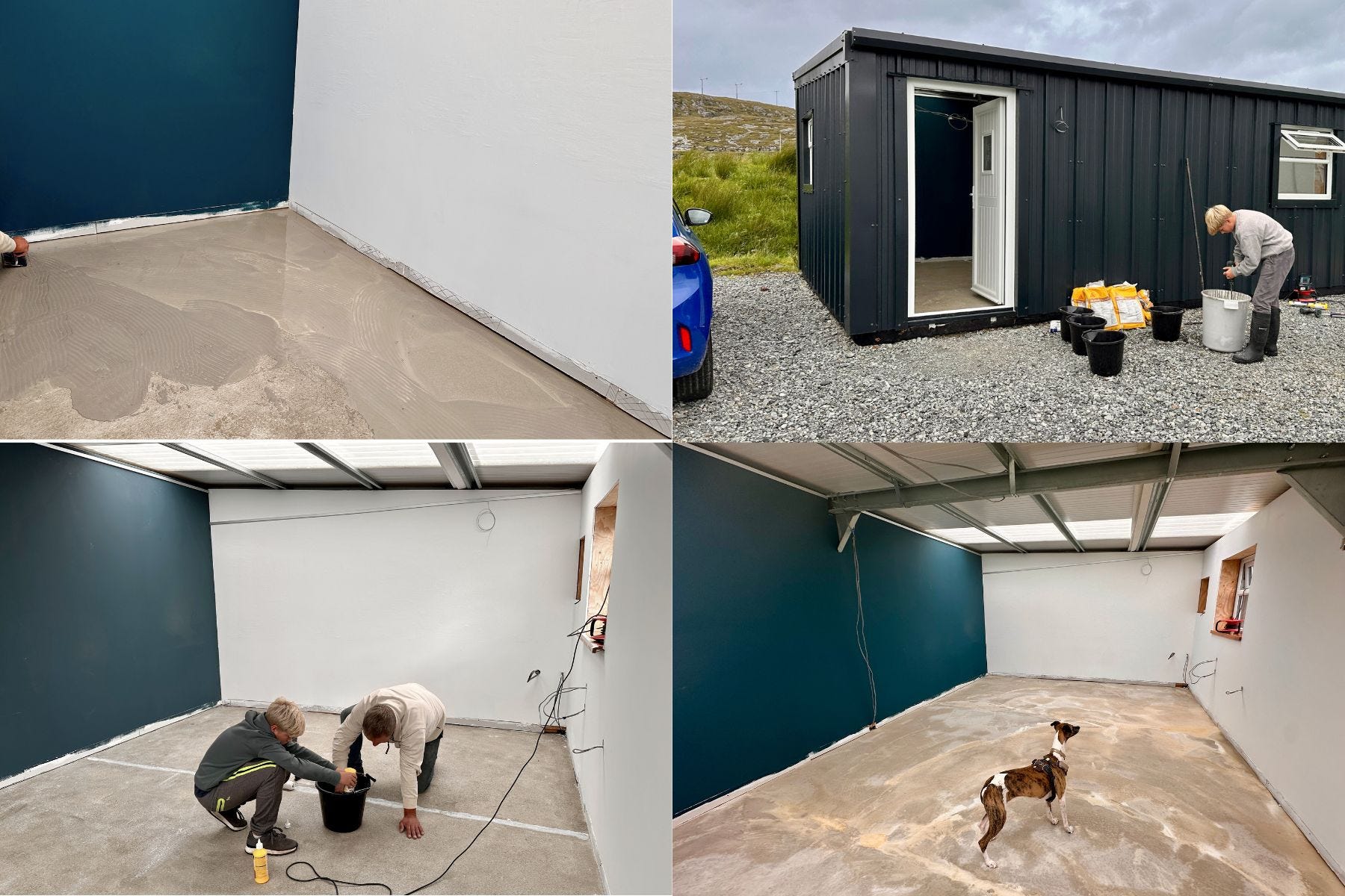 It’s exciting times as well. Last week, Carien Borst, who will be leading art sessions at the festival this year, and her family came to have a holiday in Harris and stayed in Geocrab. Her husband, Hans, is a builder, and I was barely able to contain my excitement when he offered to help a little. Their sons pitched in cheerfully and willingly as well, and I had a hanging system, skirting boards and a newly levelled floor in no time. The walls had just been painted with help from my neighbour Tricia, and so now it’s starting to look like a beautiful space.